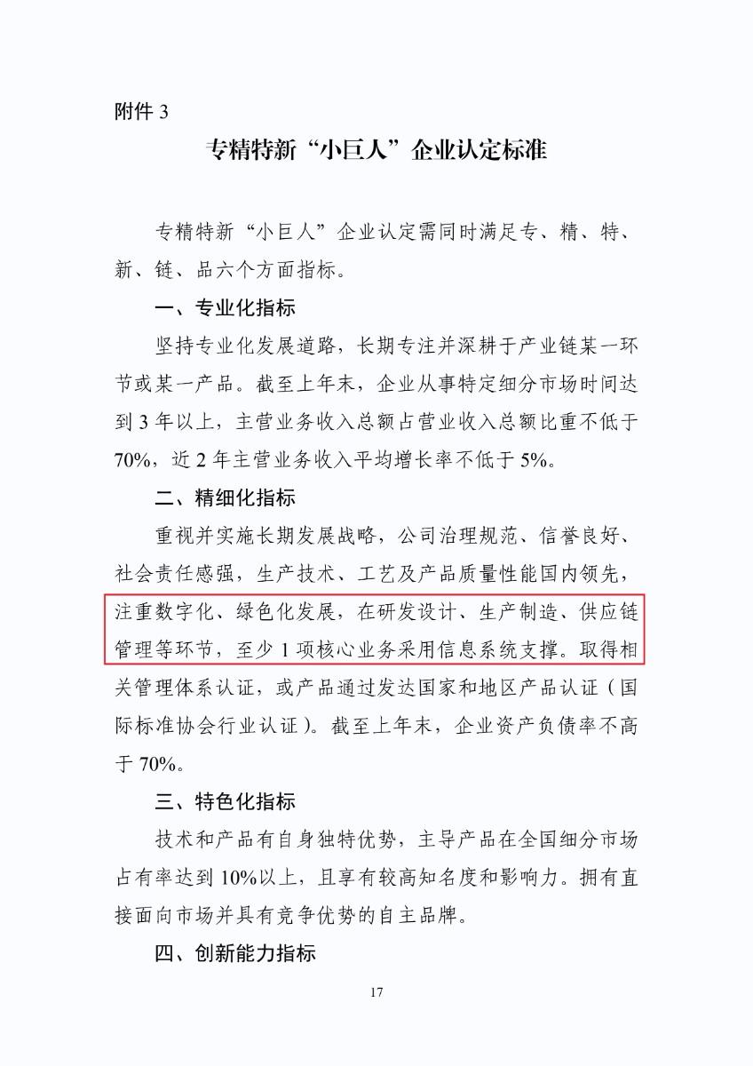 辦法中提出,專精特新中小企業“數字化水平需達到二級、三級或以上”,專精特新“小巨人”則需要“在研發設計、生產制造、供應鏈管理等環節,至少1項核心業務采用信息系統支撐。”